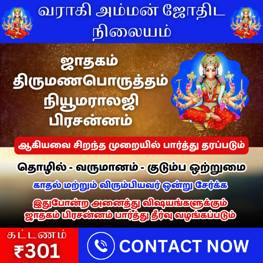 ஜாதகம், திருமண பொருத்தம், நியூமராலஜி, பிரசன்னம். ஆகியவை 100% துல்லியமாக பார்த்து தரப்படும்.